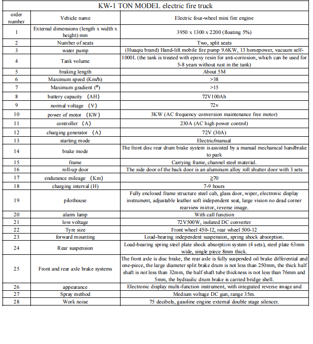Caminhão de bombeiros elétrico KW-1 TON MODELÉ um complemento importante ao sistema tradicional de proteção contra incêndios, especialmente adequado para combate inicial a incêndios, ambientes estreitos e prevenção diária. É ecologicamente correto, econômico e prático, sendo adequado para promoção em comunidades, pontos turísticos, parques industriais e outros cenários.