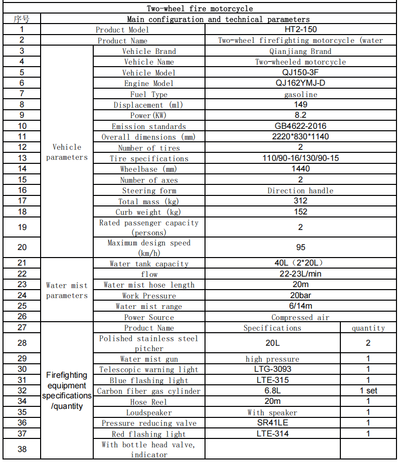 A carroceria do veículo é pequena (geralmente cerca de 2 metros de comprimento e cerca de 0,8 metros de largura) e pode ser facilmente transportada por ruas estreitas, becos em áreas antigas da cidade, ruas de pedestres, estradas pitorescas de montanha, vilas urbanas e outras áreas que grandes caminhões de bombeiros não conseguem alcançar, resolvendo o problema de cobertura de proteção contra incêndio na "última milha".